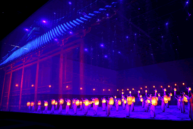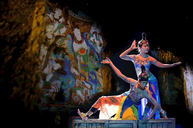 演出分为四个区域进行,四个表演区的内容相互牵引,没有时间的界限,只有历史的长流:A区历史人物的重现从遥远的那‘一条大路’走来,指引我们穿越到一百年前;B区的王道士送别飞天,人神之间的交流有的是忏悔与感动;C区置于‘窟’内,十六个窟,上百个表演面,人们如身处千百年前,以上帝视角感受当时的生活;D区古今对话,还原历史,讲述索靖镇压叛乱、张议潮收复河西以及那幅旷世绝作《药师经变图》在这片土地曾发生过的故事。故事脉络发展的同时不可忽视的是演出精妙的舞美设计和技术操控,在迷宫式的剧场中,设置了罕见的超大型联动舞台机械装置、3D影像装置、移动巨幕装置,许多特技效果均属首创,引领观众进入壮观瑰丽的幻境空间。