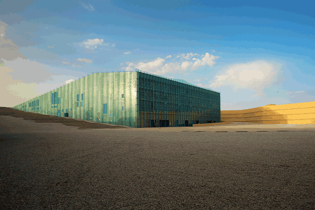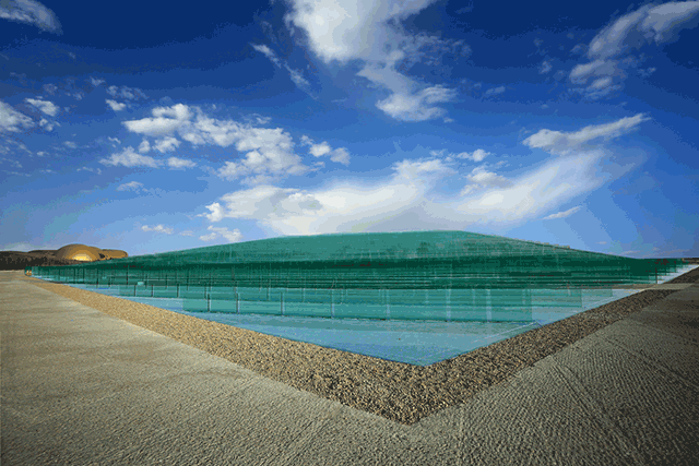 《又见敦煌》剧场的设计灵感来源于“沙漠中的一滴水”,由北京设计研究院建筑师朱小地设计。剧场位于莫高窟数字中心旁,倚临沙漠,形状似水,通体湖蓝,因此又称为‘湖蓝剧场’,下沉式结构让它遥遥望去像是一汪清泉消融向天际,意在‘沙漠中的海市蜃楼、生命与希望’。剧场共19901平方米,行走观看中感受到的不仅限于平面,多维度表演的空间、与历史人物的互动、身临其境的感官体验,将表演内容量 化的同时观众也可以更加直观的感受、贴近历史。