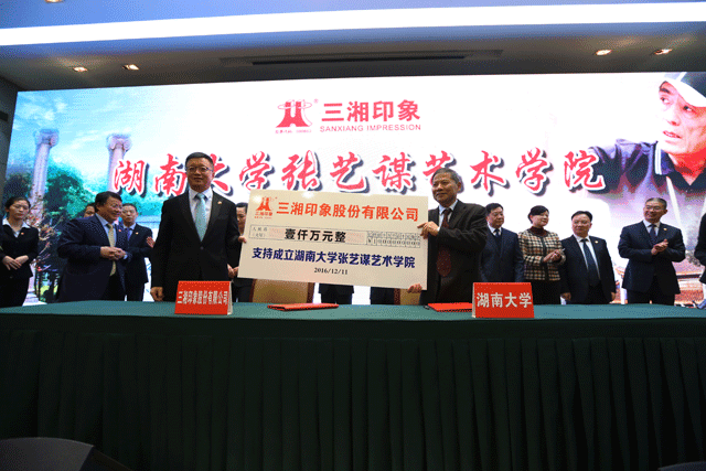 当天还举行了三湘印象与湖南大学的捐赠签约仪式,许文智代表公司向湖南大学捐赠人民币1000万元,用于支持成立“湖南大学张艺谋艺术学院”。据悉,张艺谋艺术学院将在张艺谋导演的亲自指导和帮助下,主要为大型活动培养导演、编导、制作及管理人才,打造成国际 艺术学科的人才高地和国际 高等艺术教育的湖南名片。