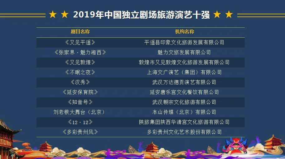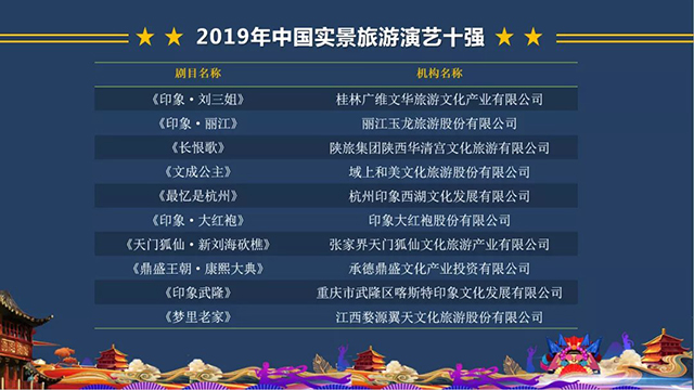 11月5日,中国旅游演艺大会在西安召开,在本届大会发布的“2019年中国实景旅游演艺十强”排行榜上,观印象的五部演艺剧目《印象刘三姐》、《印象丽江》、《最忆是杭州》、《印象大红袍》、《印象武隆》上榜,占据十强榜单的半壁江山。同时在“2019中国独立剧场演艺十强”的排行榜上,观印象的《又见平遥》、《又见敦煌》、《知音号》又占据十强榜单中的三强,以总数八强的成绩成为本届大会的大赢家。